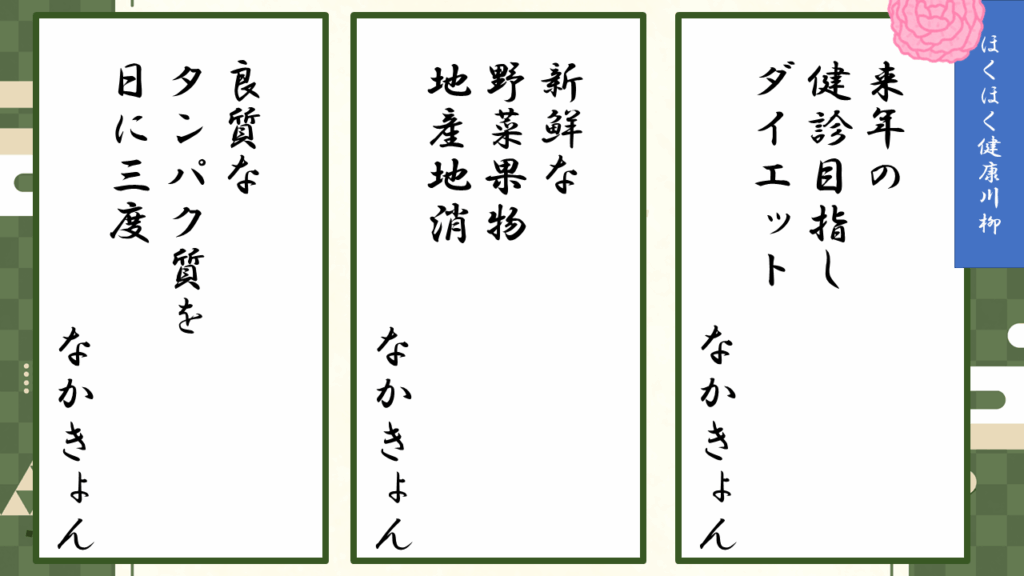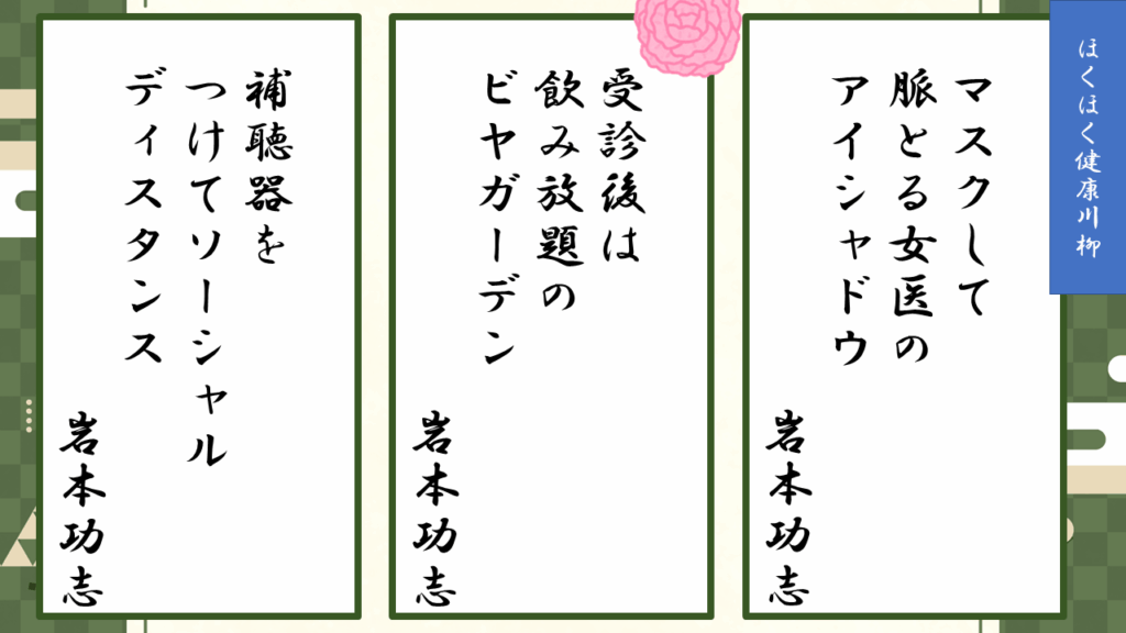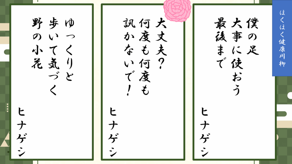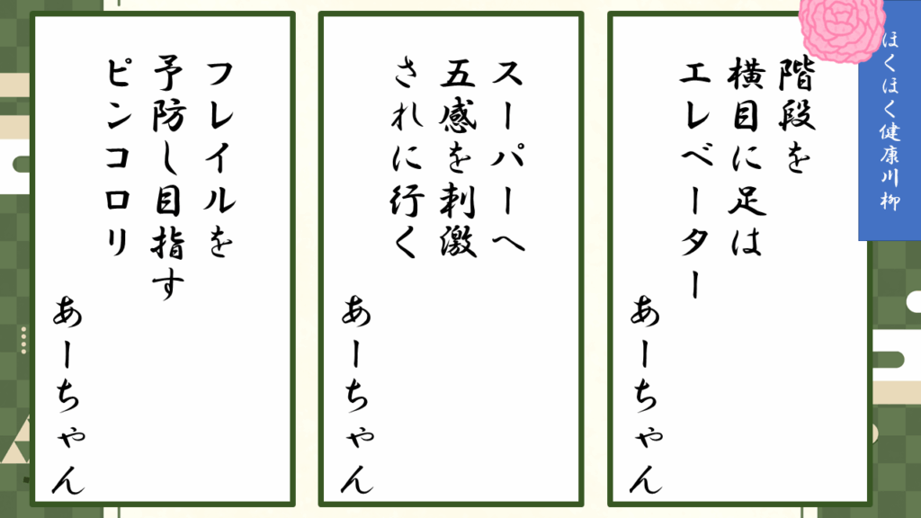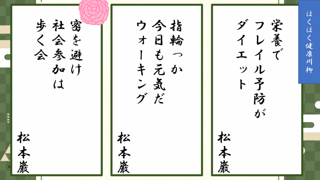 皆様には健康やフレイルに関する川柳を募集しました。今回は10名の方にご応募いただきました。1人3句作っていただき、その中でも最もいい句を東葛川柳会の永見忠士先生に 選んでいただきました。(最もいい句の上に花を付けています。)