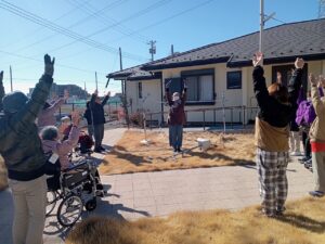 少し冷たい風が吹きながらも晴天に恵まれ、皆さん元気にお散歩を楽しみました。途中、ミカンの木や可愛い小花、畑の野菜を眺めながら「やっぱり外はいいね」と気持ちよさそうに空を見上げた横顔が輝いていました。